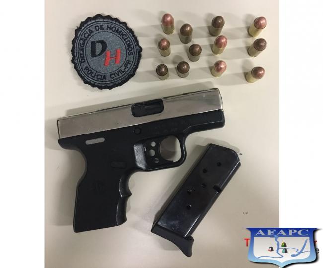 Em buscas nas imediações onde o suspeito teria corrido, foi localizado no chão uma pistola calibre .45mm com a numeração raspada, municiada com 12 cartuchos intactos do mesmo calibre. No decorrer da ocorrência, "Tiago" negou ser o proprietário da arma.