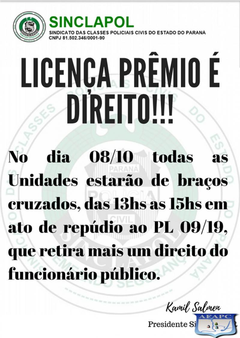 Amanhã ato público em frente ao portão de acesso à Sexta Subdivisão Policial de Foz do Iguaçu, contra deliberações na Assembléia Legislativa do Paraná, que retira o direito à Licença Prêmio dos Policiais Civis e demais funcionalismo do Executivo.