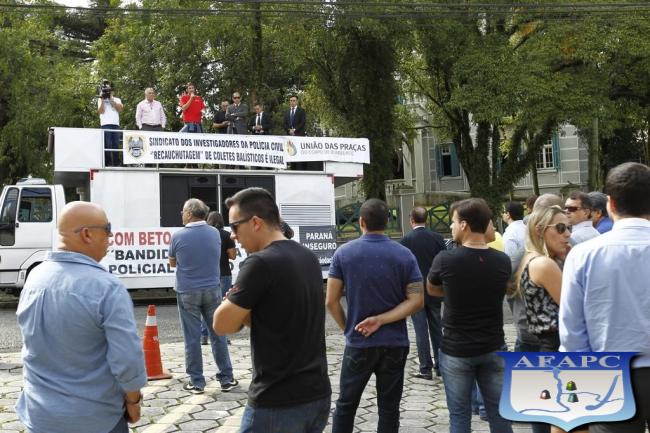 Articulado pelo Sindicato dos Investigadores do Paraná (Sipol), o ato reuniu cerca de 50 pessoas em frente à sede da Deam. Também participaram o sindicato e a associação dos delegados do Paraná (Sidepol e Adepol), as associações dos praças da Polícia Militar e dos Bombeiros (Apra-PR e UPCB-PR), e o Sindicato dos Delegados da Polícia Federal.