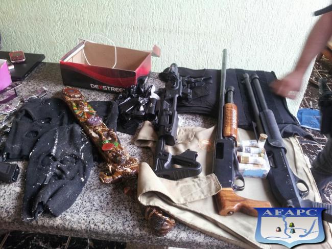Já foram apreendidas duas espingardas calibre 12, uma pistola glock 9 mm, seletor de rajada pra glock, 3 carregadores, drogas (crack), várias munições, rádios comunicadores, colete balístico, bala clava.