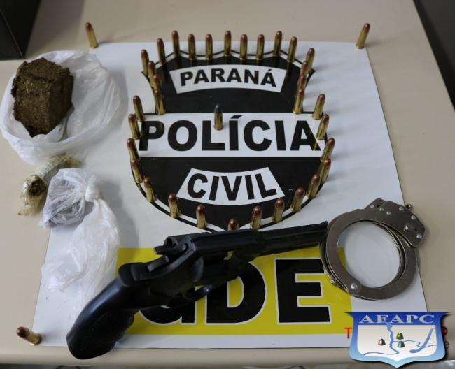 A equipe adentrou no local onde localizou os três suspeitos na residência, sobre uma cômoda foi encontrado um revólver calibre 38 municiado com seis cartuchos intactos, além de uma meia contendo trinta e dois cartuchos do mesmo calibre e em continuidade as buscas ainda foi encontrado 120 (cento e vinte) gramas de maconha e um par de algemas.