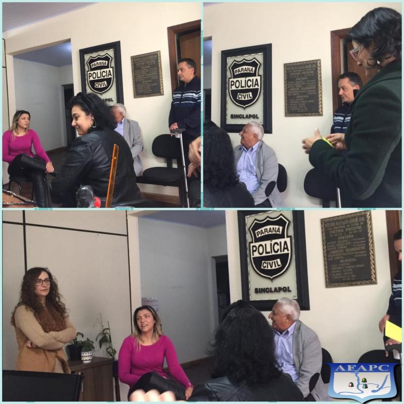 As Escrivães de Polícia que integram a Diretoria do Sindicato, Desiree Larocca, Valquiria Gil Tisque e Crislaine Antunes fizeram questão de recepcionar nosso Escrivão Veterano que nos trouxe nesta tarde muita experiência, alegria e paz.